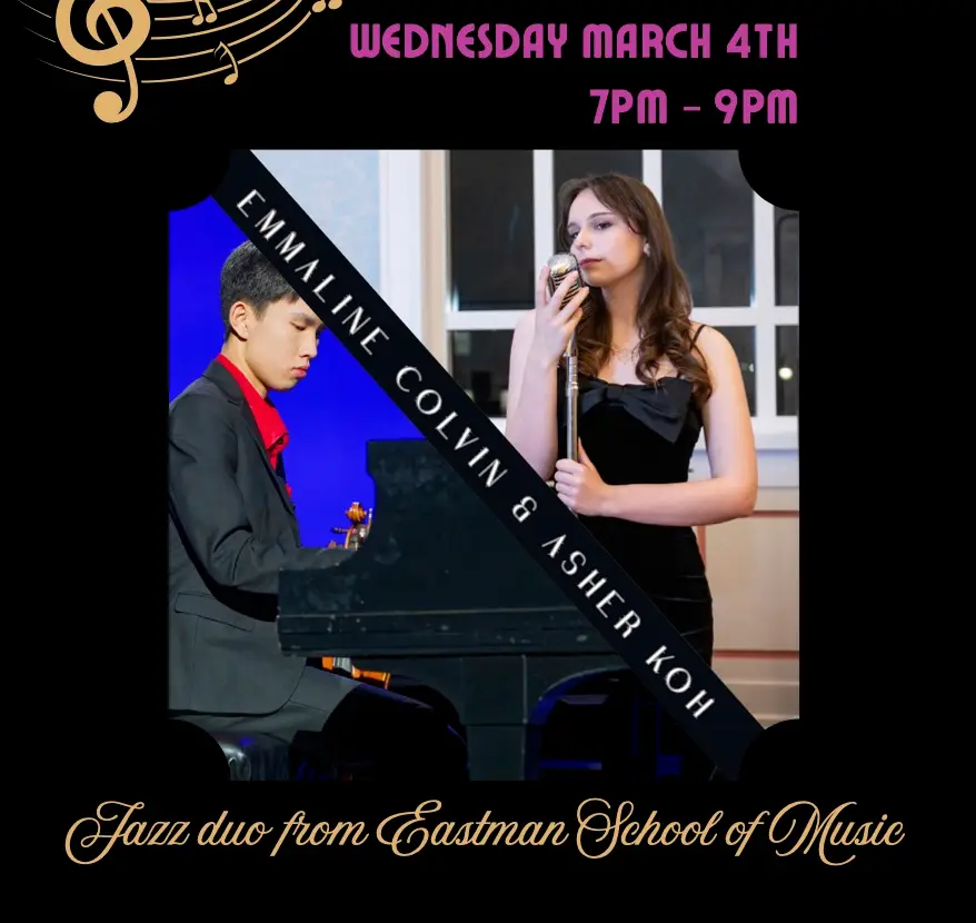 Eastman School of Music students Emmaline Colvin and Asher Koh bring classic jazz favorites to the Mercantile on March 4 from 7–9 PM. Stop by for an easy, upbeat evening of live music.